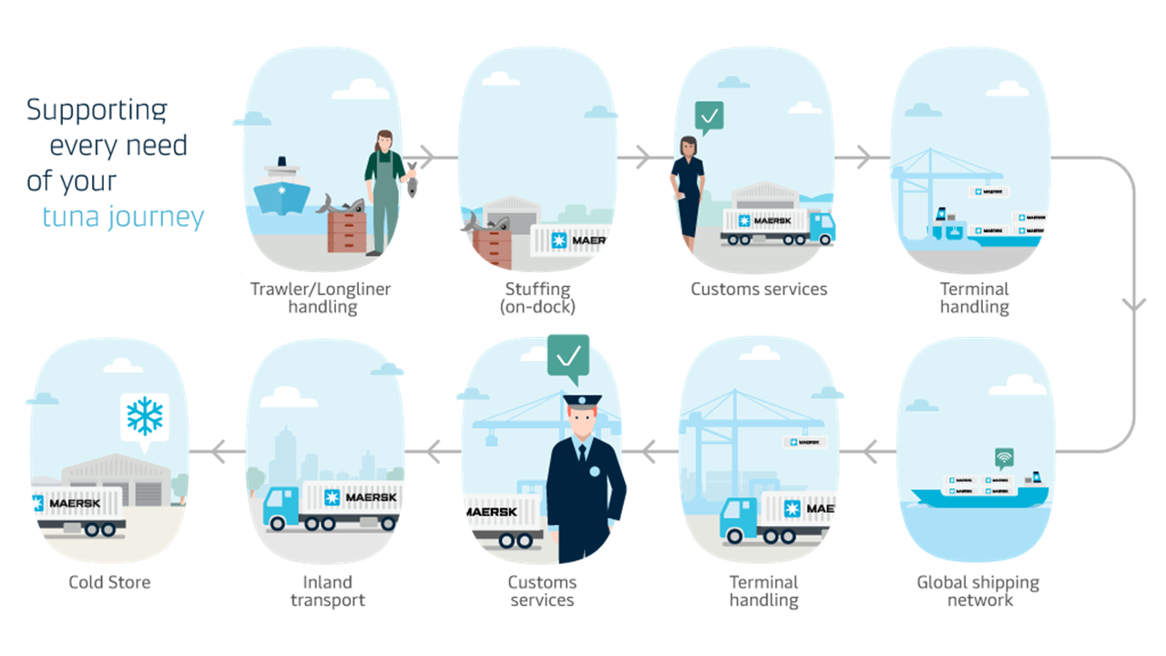 To maintain the texture, quality, and nutritional properties of the tuna throughout its journey to destination markets, Maersk employs a dual strategy: an unbroken cold chain through our one-stop solution (see graphic below) and the all-new StarFreeze™ containers.